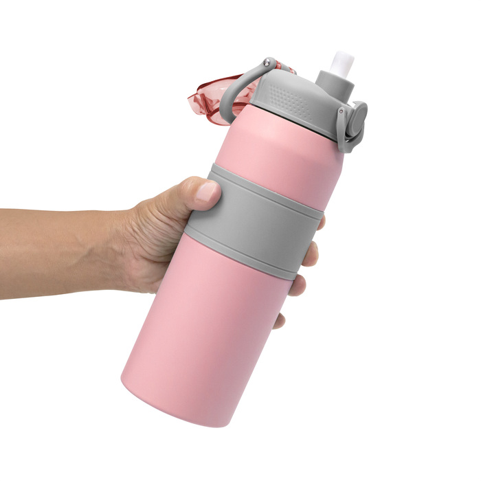 Botella deportiva con doble pared, sellada al vacío. Tapa plástica a rosca en color gris con anillo de silicona y manija plástica para su agarre, combinada con tapa rebatible en colores translucidos a juego con el color de la botella. Boquilla con sorbete incluido. Capacidad de 550 ml.